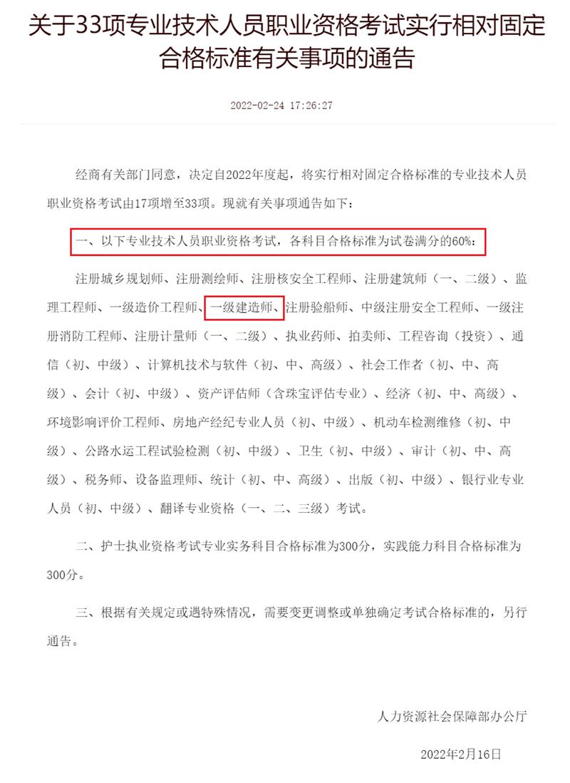 根据人力资源社会保障部办公厅《关于33项专业技术人员职业资格考试实行相对固定合格标准有关事项的通告》,一级建造师职业资格考试实行相对固定的合格标准,各科目合格标准为试卷满分的60%。根据有关规定或遇特殊情况,需要变更调整或单独确定考试合格标准的,另行通告。