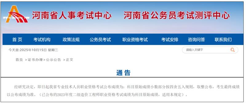 河南省人事考试中心就发了正式通知,明确专业技术人员职业资格考试的公布成绩,小数部分按四舍五入取整,考生最终成绩以公布成绩为准。